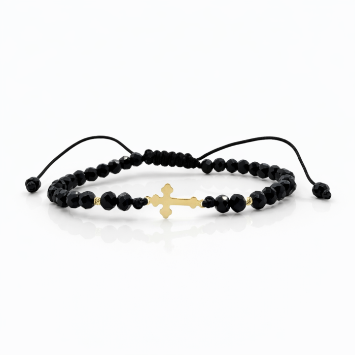 Bratara cu cruciulita, 2 bilute din aur 14k si snur impletit