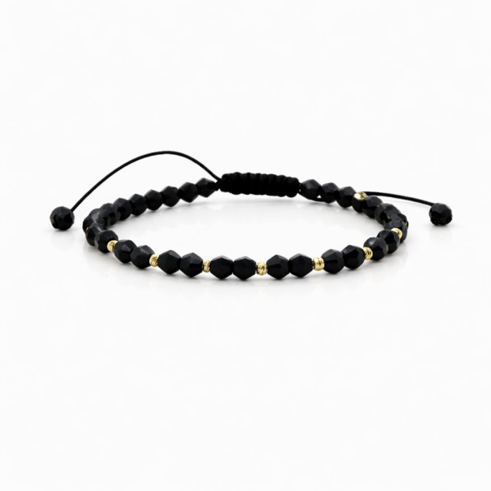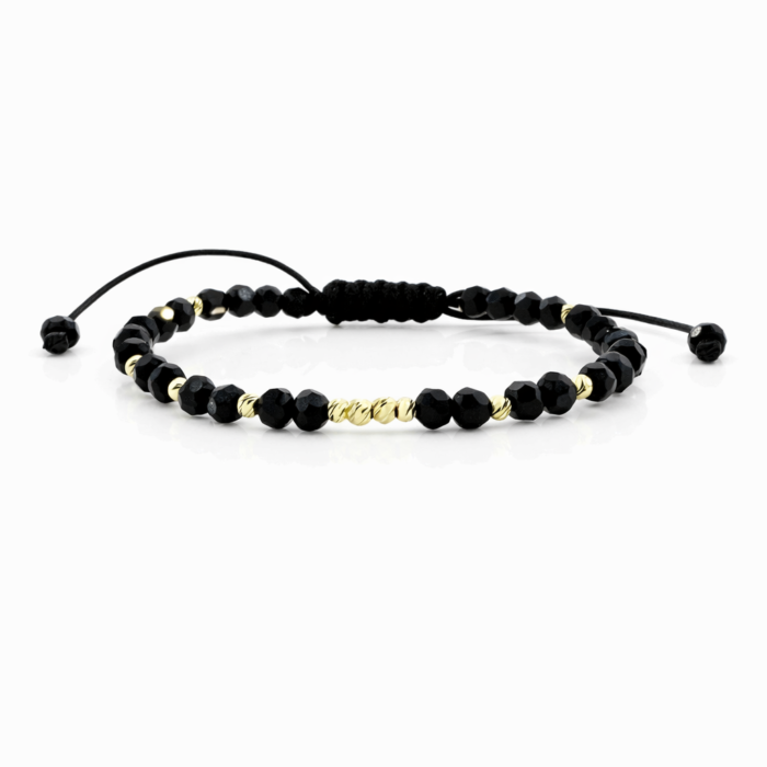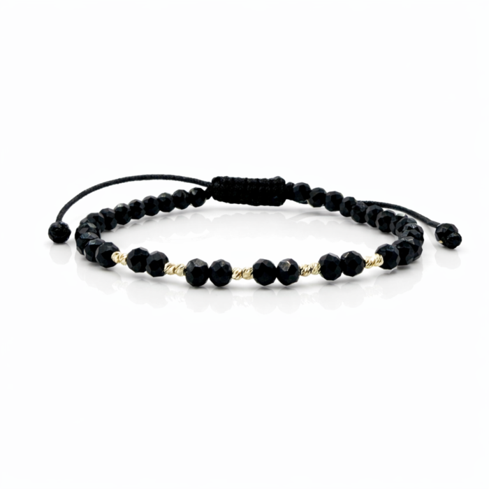 Bratara cu snur, cristale negre,bilute striate 2mm din aur 14k si margele Miyuki