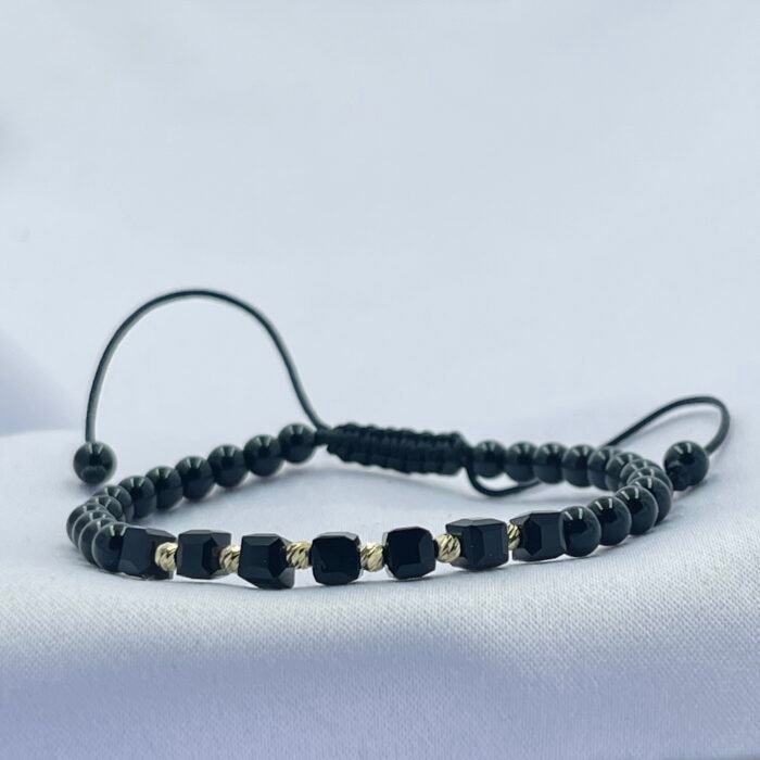 Bratara cu onix fatetat mat, charm cub si 6 bilute din aur 14k