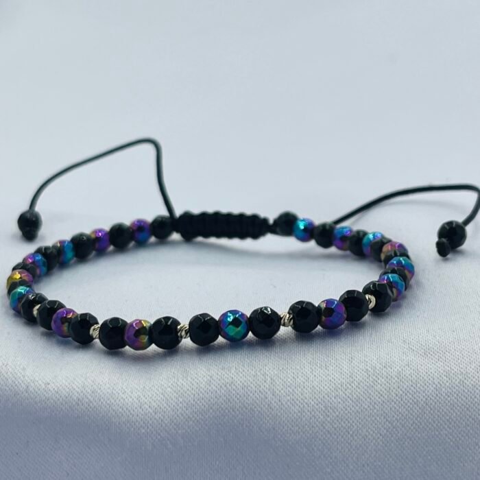 Bratara cu hematit albastru fatetat si 5 bilute din aur 14k
