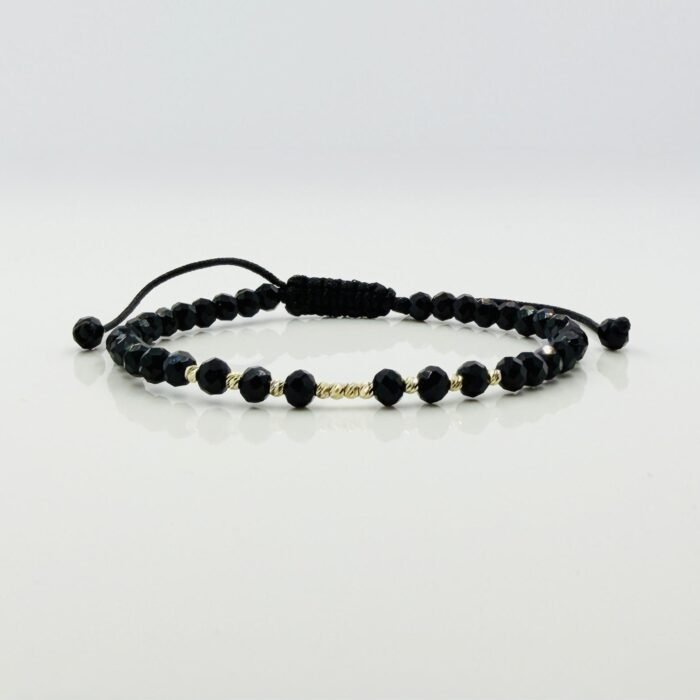 Bratara cu snur, cristale negre,bilute striate 2mm din aur 14k si margele Miyuki
