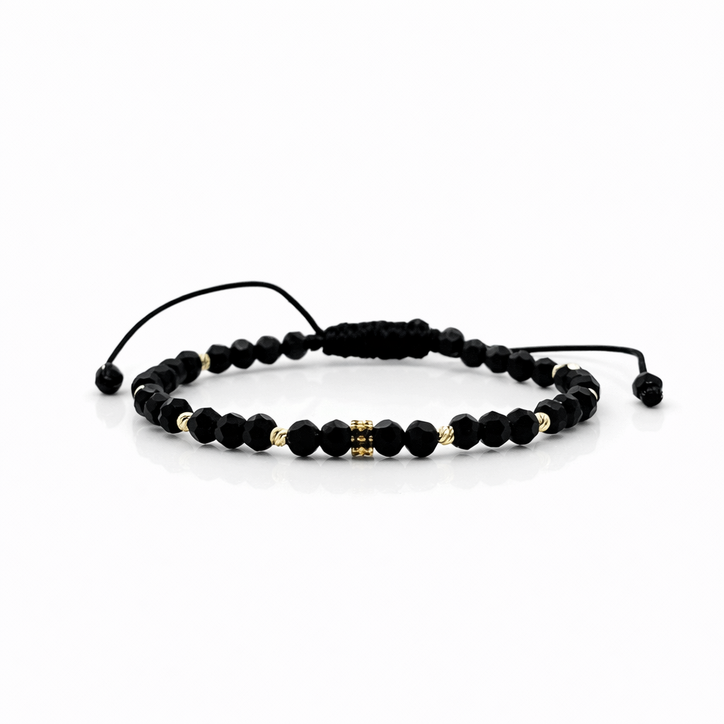 Descoperiți brățara noastră exclusivă, realizată din aur de 14k, cu opt biluțe strălucitoare și un charm elegant, împodobit cu pietricele negre și cristale.