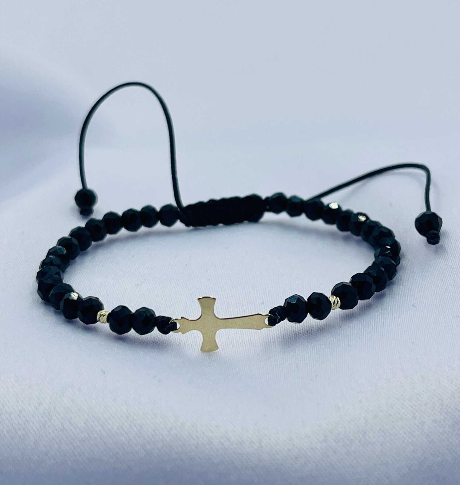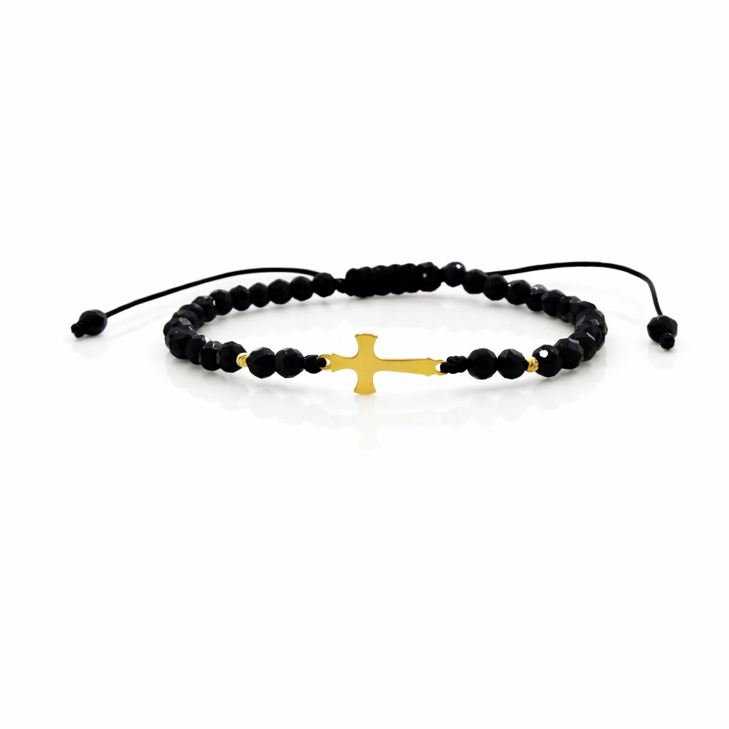 Această brățară cu cristale din sticla, biluțe striate din aur 585 14K si cruciulita de 1cm este printre preferatele clienților noștri, având un design elegant și fiind ușor de purtat și asortat în diverse ținute vestimentare.