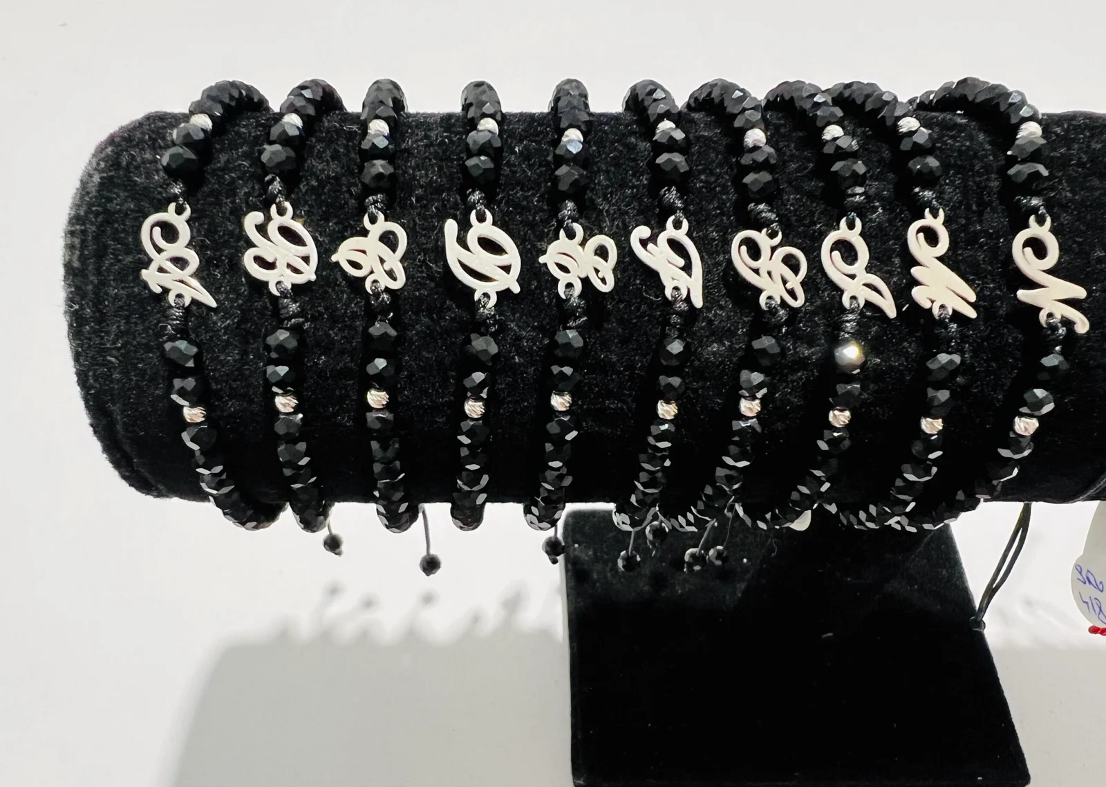 Initiala si cele 2 biluțe striate de 2.5mm sunt înșirate minuțios pe șnurul fin de mătase pe centrul bratarii.
