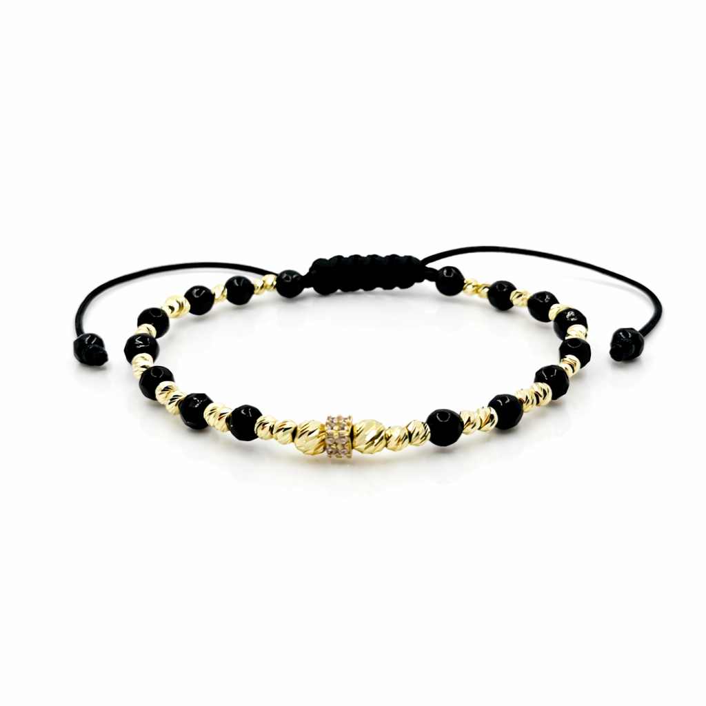 Bratara cu onix, charm si bilute de diferite dimensiuni din aur 14k
