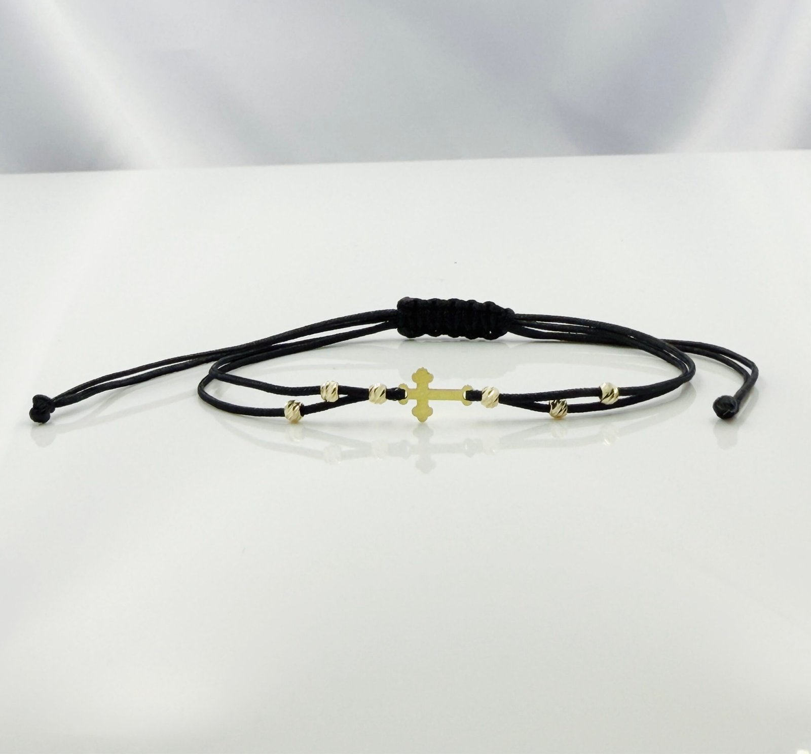 Brățară realizată cu șnur, link cruciuliță de 1cm și 6 biluțe de 2,5mm din aur 585 14K
