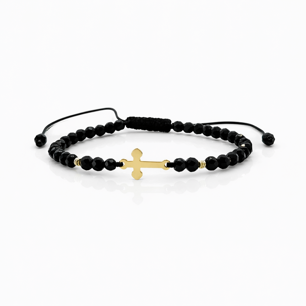 Această brățară este decorată cu o cruce plină, ce adaugă o notă spirituală, și este accentuată de 6 biluțe din aur de 14k, care conferă un aspect sofisticat și modern.