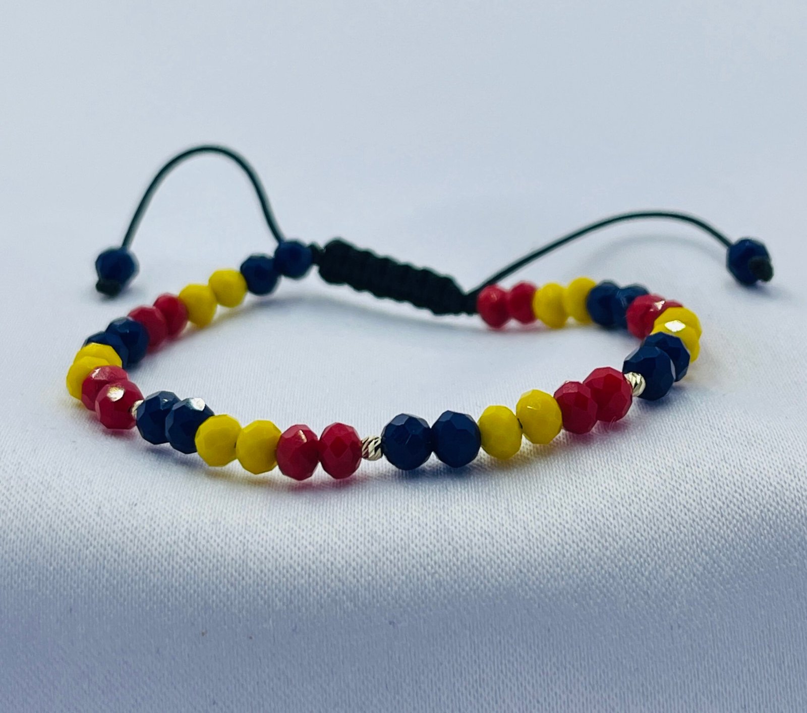 Poartă cu mândrie culorile României! Această brățară elegantă îmbină simbolurile naționale cu rafinamentul bijuteriilor fine. Realizată manual, brățara are un șnur cu cristale – roșu, galben și albastru – ce reprezintă spiritul și unitatea românească, completat de biluțe din aur galben de 14K și cristale strălucitoare, pentru un plus de eleganță și rafinament.